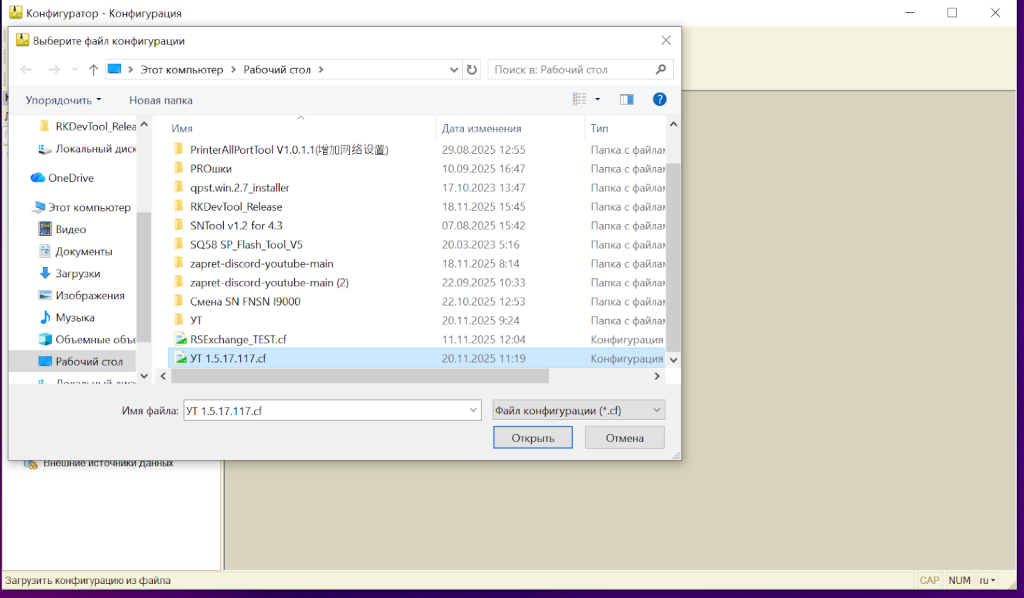 Далее нажимаем на вкладку “Конфигурация” сверху и нажимаем открыть конфигурацию. В этом же всплывающем окне необходимо “Загрузить конфигурацию из файла” и выбрать файл, который вы скачивали в самом начале.