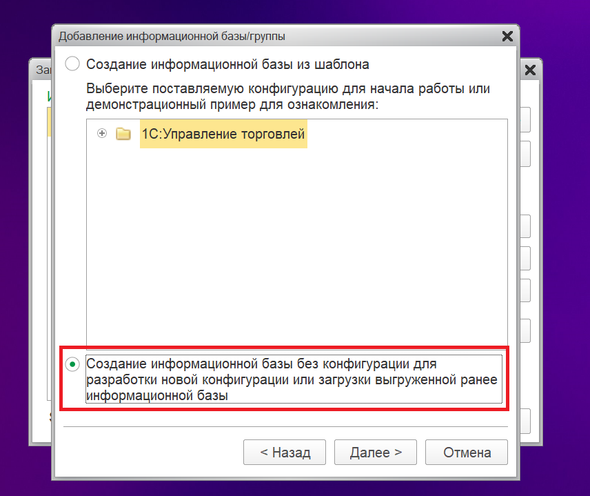 В всплывающем окне вам необходимо создать информационную базу без конфигурации для разработки.