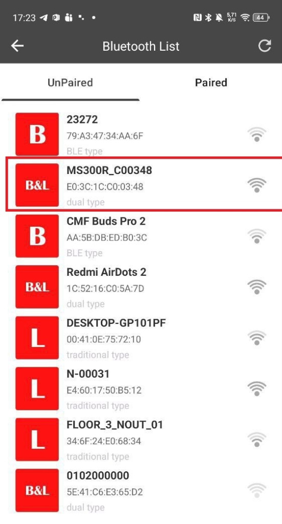 6. Открывается список устройств, найдите в нём своё кольцо, как показано на примере