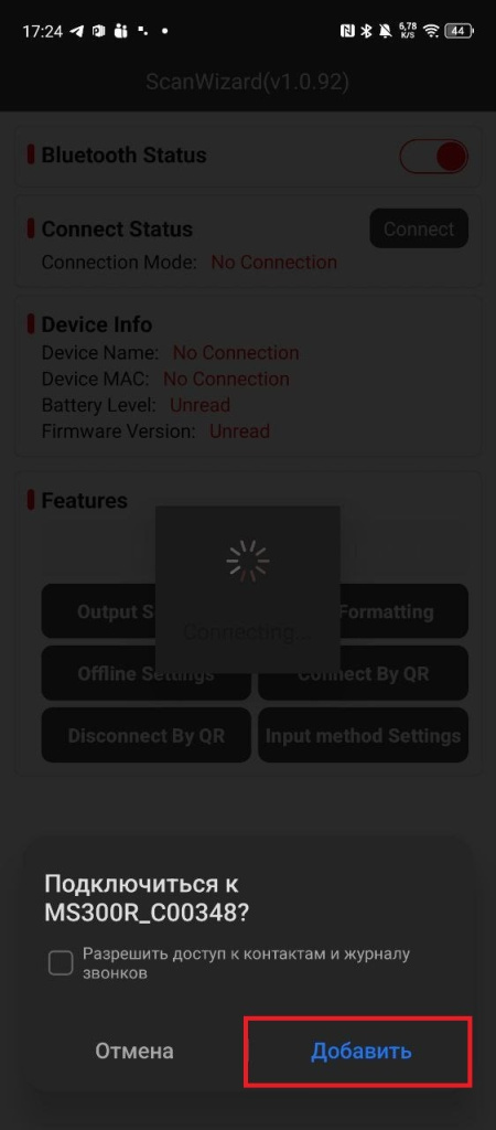 7. В появившемся окне выбора метода подключения "Choose a connection method" выберите пункт “SPP Mode” и после “Добавить”