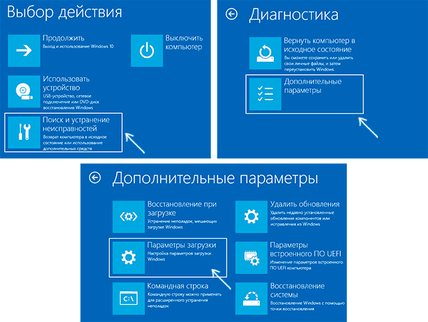 После перезагрузки, пройдите по следующему пути: «Поиск и устранение неисправностей» (или «Диагностика») — «Дополнительные параметры» — «Параметры загрузки» и нажмите кнопку «Перезагрузить».