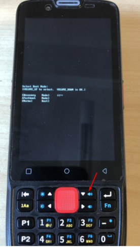 3. Устройство перейдет в режим выбора загрузки, выбираете Recovery Mode и нажимаете кнопку громкости «+» (стрелочка вниз)
